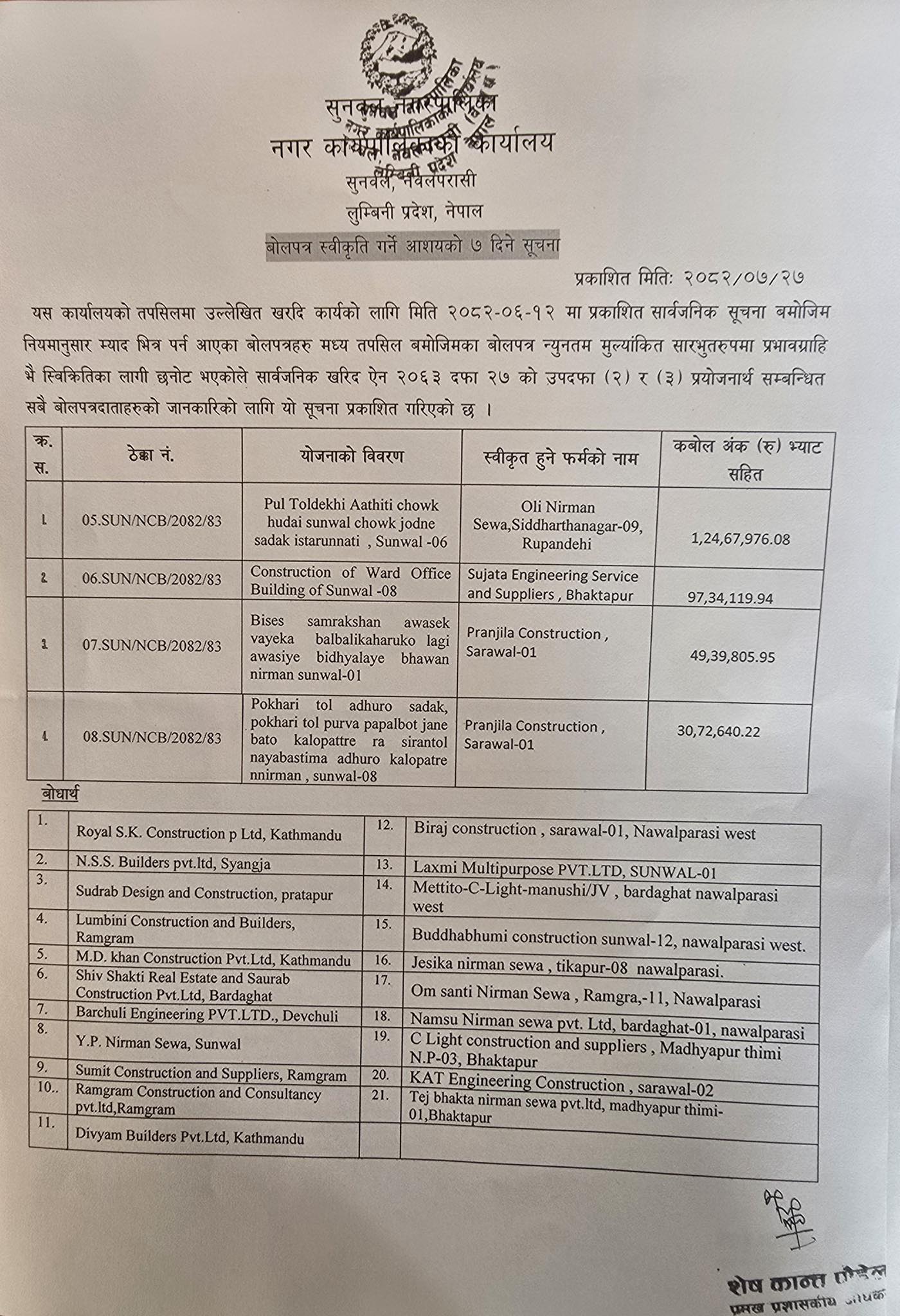 बोलपत्र स्विकृत गर्ने आशयको सूचना
