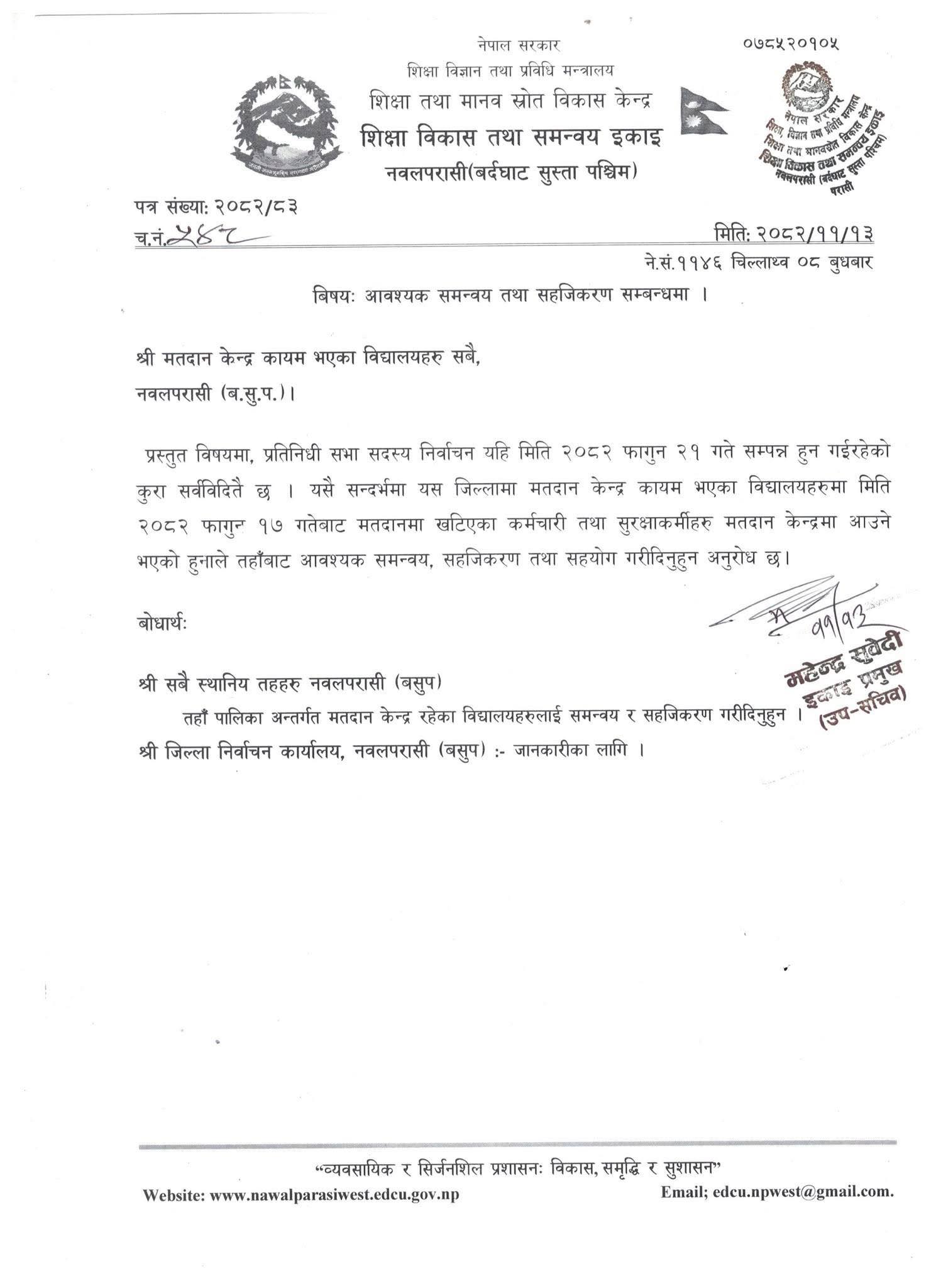 श्री सुनवल नगरपालिका अन्तर्गतका मतदान केन्द्र कायम भएका विद्यालयहरुको लागि शिक्षा विकास तथा समन्वय इकाइको जरुरी सूचना
