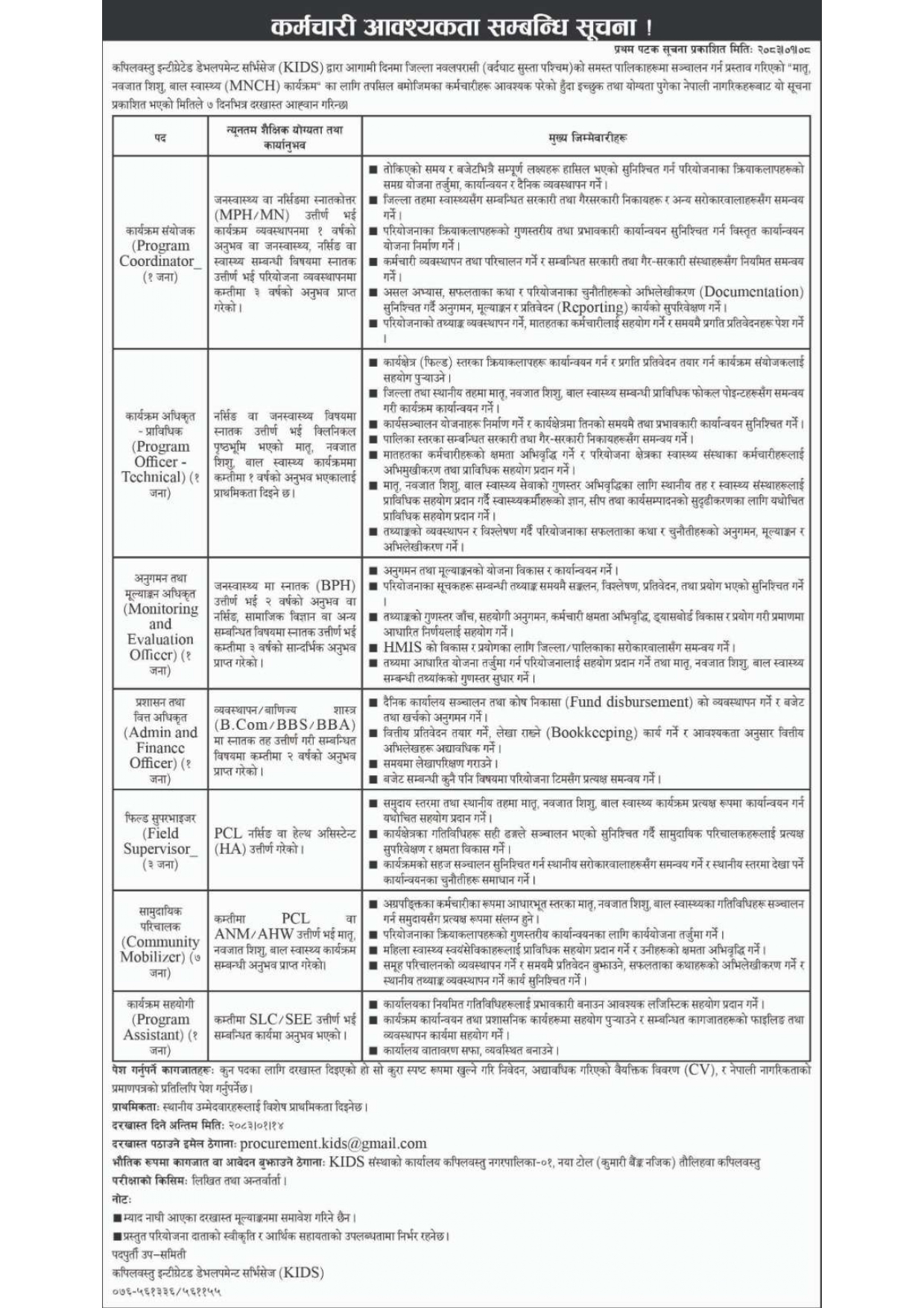 प्रस्तुत विषयका सम्बन्धमा कपिलवस्तु इन्टीग्रेटेड डेभलपमेन्ट सर्भिसेज (KIDS) द्वारा आगामी दिनमा नवलपरासी (बर्दघाट सुस्ता पश्चिम) जिल्ला अन्तर्गतका समस्त पालिकाहरूमा "मातृ, नवजात शिशु, बाल स्वास्थ्य (MNCH) कार्यक्रम" सञ्चालन गर्न प्रस्ताव गरिएको व्यहोरा जानकारी गराउदै सो प्रस्तावित कार्यक्रमको लागि आवश्यक जनशक्ति व्यवस्थापनको लागि विज्ञापन भइसकेकोले सो विज्ञापन सुचना पालिकाको सुचना पाटी तथा आधिकारिक सामाजिक सञ्जाल पेजमा प्रकाशन गरिएको छ ।