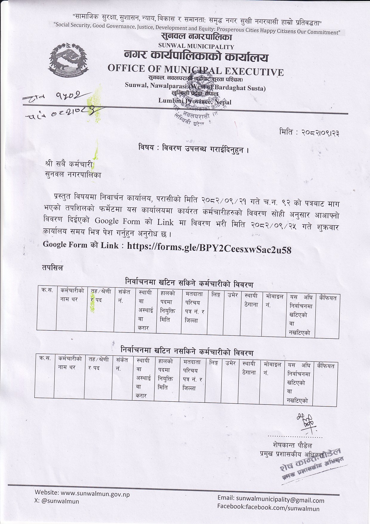 प्रस्तुत विषयमा निर्वाचन कार्यालयको २०८२/०९/२१ गते च.न. ९२ को प्राप्त पत्रबाट यस कार्यालयमा कार्यरत कर्मचारीहरुको विवरण माग भएकोले सोही अनुसार आआफ्नो विवरण दिईएको Google Form को Link मा विवरण भरी मिति २०८२/०९/२५ गते शुक्रवार कार्यालय समय भित्र पेश गर्नुहुन अनुरोध छ ।