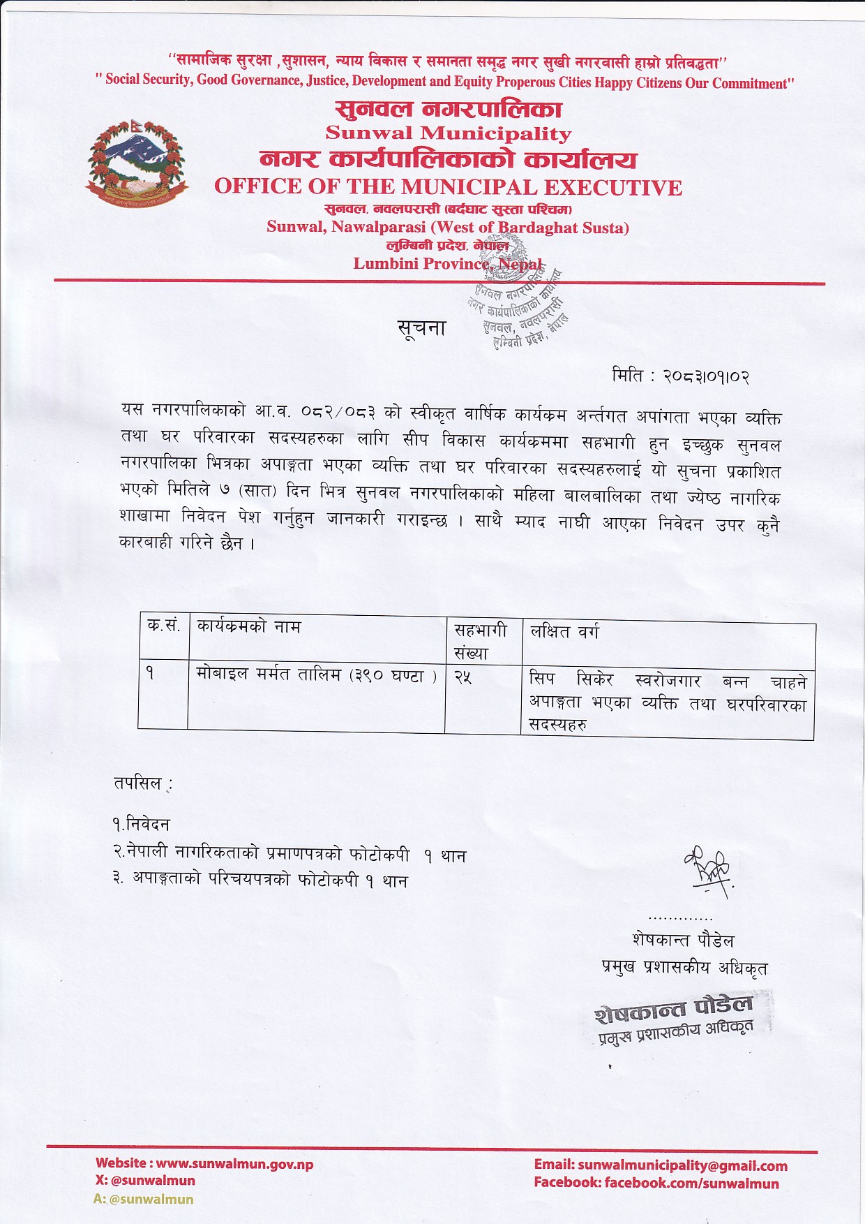 यस नगरपालिकाको आ.व. ०८२/०८३ को स्वीकृत वार्षिक कार्यकम अन्र्तगत अपांगता भएका व्यक्ति तथा घर परिवारका सदस्यहरुका लागि सीप विकास कार्यक्रममा सहभागी हुन इच्छुक सुनवल नगरपालिका भित्रका अपाङ्गता भएका व्यक्ति तथा घर परिवारका सदस्यहरुलाई यो सुचना प्रकाशित भएको मितिले ७ (सात) दिन भित्र सुनवल नगरपालिकाको महिला बालबालिका तथा ज्येष्ठ नागरिक शाखामा निवेदन पेश गर्नुहुन जानकारी गराइन्छ । साथै म्याद नाघी आएका निवेदन उपर कुनै कारबाही गरिने छैन ।