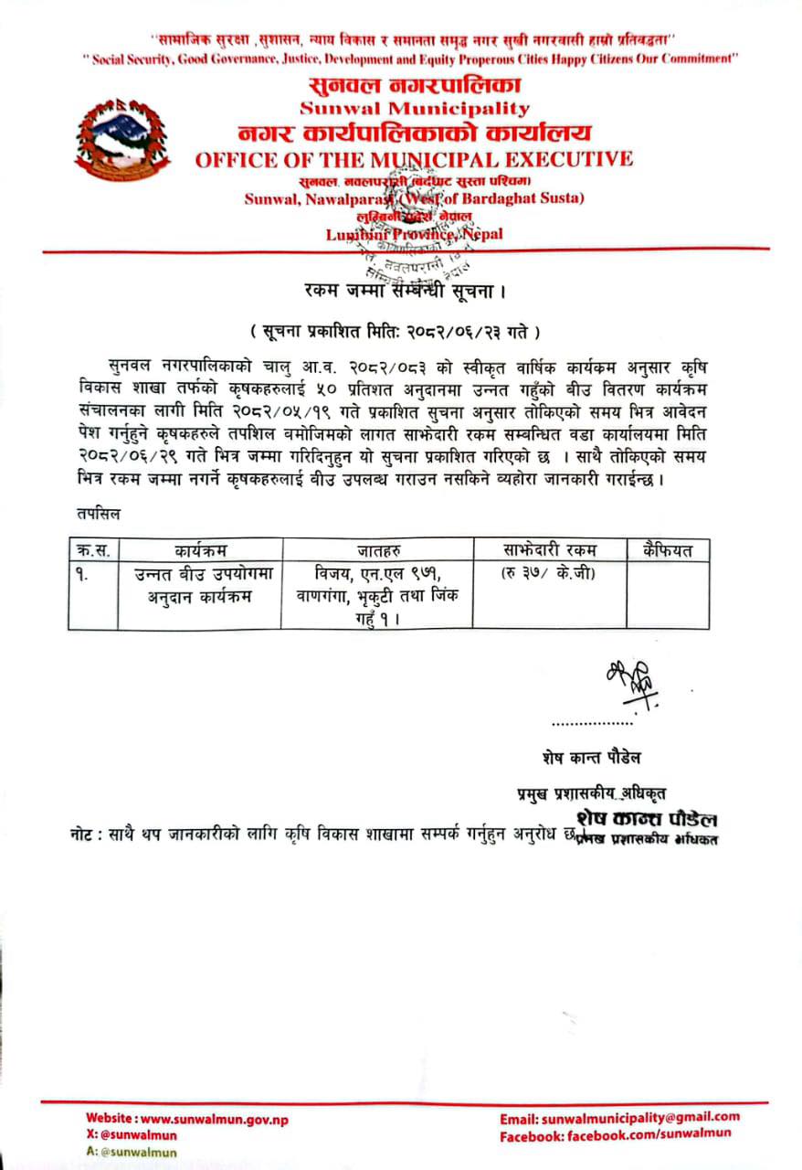 सुनवल नगरपालिकाको चालु आ.व. २०६२/०६३ को स्वीकृत बार्षिक कार्यकम अनुसार कृषि विकास शाखा तर्फको कृषकहरुलाई ५० प्रतिशत अनुदानमा उन्नत गहुँको बीउ वितरण कार्यकम संचालनका लागी मिति २०६२/०५/१९ गते प्रकाशित सुचना अनुसार तोकिएको समय भित्र आवेदन पेश गर्नुहुने कृषकहरुले तपशिल बमोजिमको लागत साझेदारी रकम सम्बन्धित वडा कार्यालयमा मिश्रीत २०८२/०६/२९ गते भित्र जम्मा गरिदिनुहुन यो सुचना प्रकाशित गरिएको छ। साथै तोकिएको समय नित्र रकम जम्मा नगर्ने कृषकहरुलाई बीउ उपलब्ध गराउन नसकिने व्यहोरा जानकारी गराईन्छ ।