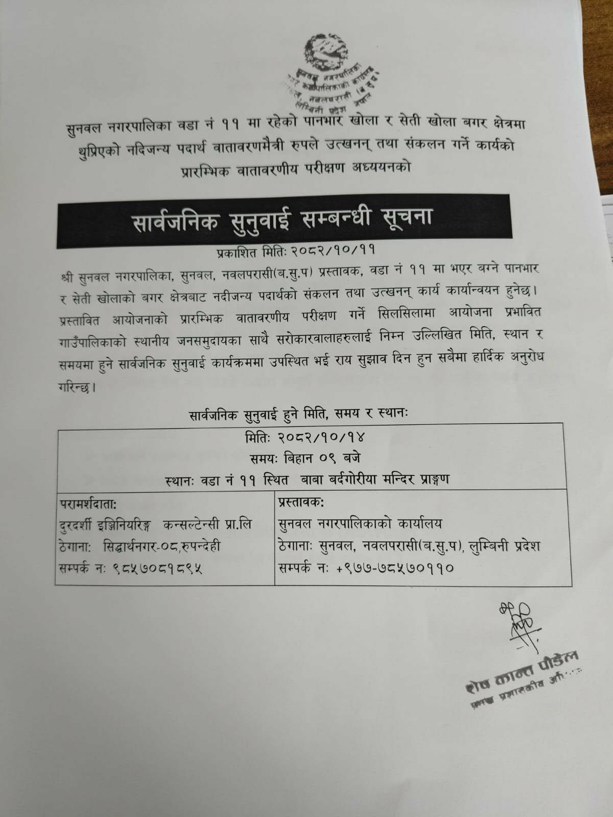 श्री सुनवल नगरपालिका, सुनवल, नवलपरासी (ब.सु.प) प्रस्तावक, बडा नं ११ मा भएर बग्ने पानभार र सेती खोलाको बगर क्षेत्रबाट नदीजन्य पदार्थको संकलन तथा उत्खनन् कार्य कार्यान्वयन हुनेछ। प्रस्तावित आयोजनाको प्रारम्भिक बातावरणीय परीक्षण गर्ने सिलसिलामा आयोजना प्रभावित पालिकाको स्थानीय जनसमुदायका सबै सरोकारवालाहरुलाई निम्न उल्लिखित मिति, स्थान र समयमा हुने सार्वजनिक सुनुवाई कार्यक्रममा उपस्थित भई राय सुझाव दिन हुन सबैमा हार्दिक अनुरोध