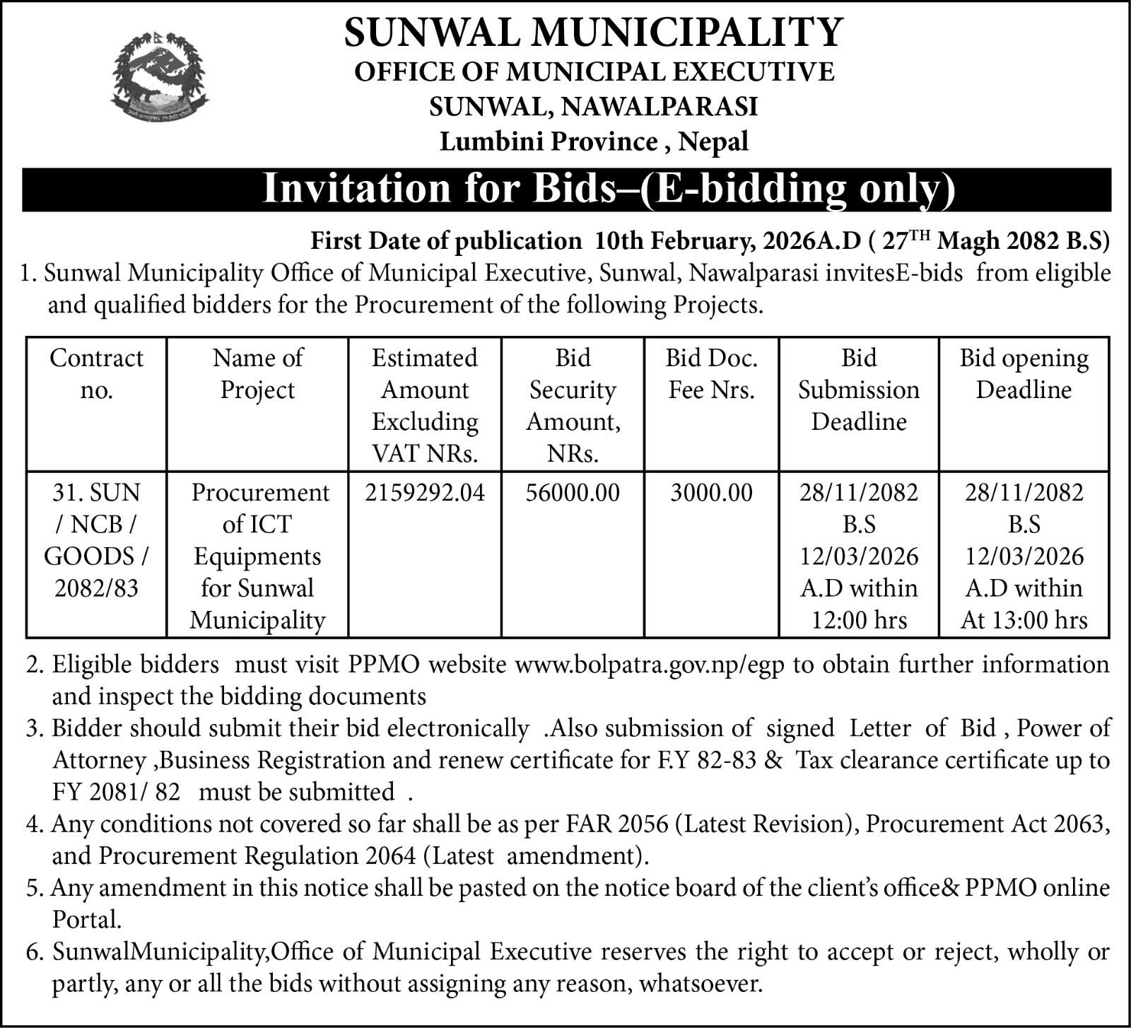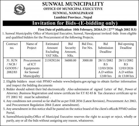 Invitation for Bids-(E-bidding only) First Date of publication 10th February, 2026A.D (27TH Magh 2082 B.S)
