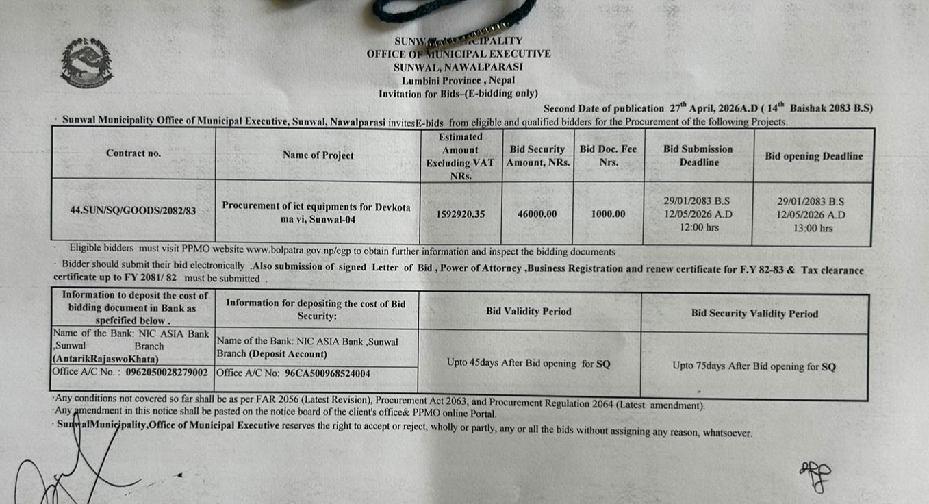 Invitation for Bids ( Second date of publication: 14th Baisakh 2083 )